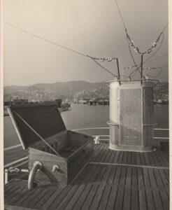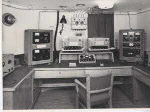 In questa foto segnaliamo i soli apparati non visibili nella precedente, sulla destra appoggiato sul tavolo appare il ricetrasmettitore radiotelefonico in modulazione di ampiezza modello “ALDEBARAN I” prodotto dalla IRME di Roma, questo RTX aveva la copertura della banda della Radiofonia da 550 kHz a 1600 kHz per l’ascolto delle varie emittenti broadcasting e quindi per la ricezione dei notiziari e quanto offerto dai servizi delle BC, quindi l’apparato copriva la banda marina delle onde medie da 1.6 a 2.9 MHz per il traffico RTF (radiotelefonico) eppoi una banda HF ossia da 8 a 9 MHz per i collegamenti a più lunga distanza. In trasmissione l’apparato era quarzato e aveva 5 frequenze per lo svolgimento del traffico RTF. A terra si nota il ricetrasmettitore per le lance di salvataggio modello NAUTILUS.
