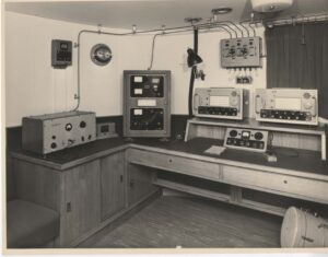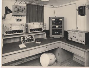 Nella foto 2 una panoramica della stazione radio della nave, al centro il tavolo operatore con due ricevitori dell’ALLOCCHIO BACCHINI modello AC 16, quello di destra a copertura continua fino a 30 MHz mentre quello di sinistra con la sola copertura delle Onde Lunghe e Medie, dietro questo ricevitore installato a paratia il grosso commutatore di antenna. Sotto i ricevitori una consolle per lo smistamento del tasto telegrafico sui vari trasmettitori. A destra appare il TX radiotelegrafico principale della MARCONI ITALIANA per le Onde Corte, si tratta del modello T-300-OC, il trasmettitore sul lato opposto è invece il TX radiotelegrafico principale per le Onde Medie (banda dei 500 kc/s) modello T-300-OM sempre della MARCONI ITALIANA, sulla destra di questo apparato si nota il “tubo portaordini” o “tubo portavoce” per le comunicazioni tra il Ponte di Comando e la stazione RT, sulla sinistra appaioni alcuni apparati descritti in una foto successiva mentre citiamo il grosso orologio di stazione con evidenziati i minuti di silenzio per la grafia e quindi con obbligo di ascolto della frequenza dei 500 kc/s.