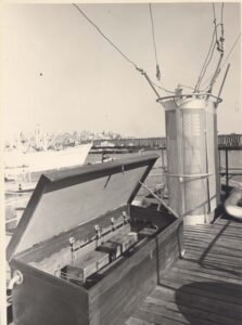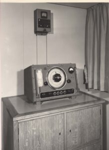 Nella foto sopra, oltre agli apparati descritti nella foto precedente appare in fondo, nell’angolo a sinistra, il TX radiotelegrafico principale per le Onde Corte T-300-OC della MARCONI ITALIANA, a paratia sono installati alcuni quadri elettrici e sul tavolo in posizione centrale appare il commutatore per l’alimentazione di emergenza, subito a destra è installato il TX di emergenza per la banda dei 500 kc/s di marca IRME, si tratta del modello T50-5, a terra il ricetrasmettitore per scialuppa di salvataggio tipo NAUTILUS. In questa foto sulla destra, nella parte avanti è collocato l’apparato radiotelefonico in modulazione di ampiezza tipo SAGITTARIO per Onde Medie e Corte (bande dei 4, 6, 8, 12, 16, 22 MHz) prodotto dalla IRME.