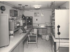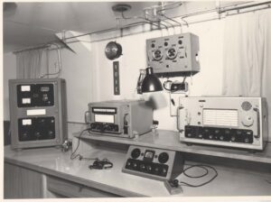 Nella foto 2 la postazione principale della Stazione RT. I due ricevitori sono, quello di sinistra, l’ RX 1241 prodotto dalla MARCONI ITALIANA con copertura da 15 kHz a 3 MHz, mentre l’RX di destra è un ALLOCCHIO BACCHINI mod. AC 16 con copertura delle Onde Corte. Al centro del tavolo sotto i ricevitori una consolle per lo smistamento del tasto sui vari TX’s e per l’avviamento dei survoltori per l’alimentazioni anodiche. Sempre al centro, installato a paratia sopra i due ricevitori il grosso commutatore per le antenne di trasmissione, sulla sua sinistra l’orologio di stazione e la targa con il nominativo. Nell’angolo a sinistra il trasmettitore principale radiotelegrafico per la banda dei 500 kc/s, si tratta del T-300-OM prodotto dalla MARCONI ITALIANA.