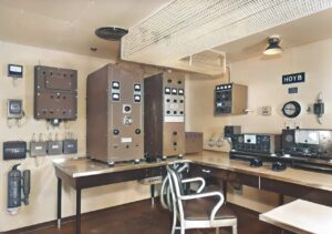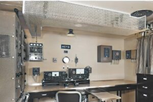 In questa foto si possono ammirare i due ricevitori in dotazione alla nave prodotti dalla RCA Marine (sezione apparati marittimi della RCA U.S.A.), il ricevitore sulla sinistra è il modello AR 8510, questo ricevitore era costruito per avere una copertura di frequenza continua tra 15 e 650 kc/s in conformità con le normative FCC, era un ricevitore a reazione dedicato all’ascolto della 500 kc/s ed era predisposto al funzionamento a batteria, quindi adatto anche per il servizio di emergenza. Il ricevitore più grande è invece il modello AR-8506-B, questo ricevitore era quello principale ed era del tipo supereterodina a dieci tubi con copertura dell’intervallo di frequenza da 85 a 550 kc/s e da 1,9 a 25 Mc/s; poteva essere alimentato direttamente a 115 AC oppure in DC. Sulla destra della foto a partire dalla tenda dell’oblò appaiono tre dispositivi installati a paratia il primo era il manipolatore del segnale d’allarme per la 500 kc/s ossia il dispositivo che generava le dodici linee costituenti il segnale di allarme che andava lanciato prima della trasmissione del segnale di soccorso, si tratta del modello AR-8651 ALARM SIGNAL KEYER, di seguito altri due apparati che costituivano il ricevitore automatico del segnale di auto allarme sulla 500 kc/s (sul dispositivo di mezzo si nota il gosso campanello d’allarme). Al centro della stazione radio, a paratia in corrispondenza dei due ricevitori, l’orologio di stazione e la targa con il nominativo della nave, sempre a paratia ci sono altri dispositivi alcuni collegati con le alimentazioni degli apparati, in alto a sinistra appare un grosso dispositivo che è collegato in uscita ad un’antenna, al momento della redazione di questo articolo non dispongo di informazioni relative a questo device ma potrebbe trattarsi di un TX di emergenza o di un sistema per la commutazioni delle antenne, sono graditi eventuali suggerimenti per completare questa descrizione.