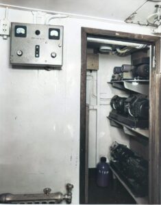 Nella foto 2 la postazione operatore con i due ricevitori di cui fu equipaggiata la nave in Italia. I due RX sono i ben noti ALLOCCHIO BACCHINI modello AC/16 il ricevitore di destra è l’AC/16 a copertura continua da 1,4 a 25 MHz mentre il ricevitore di sinistra aveva la copertura delle Onde Lunghe e Medie ossia da 75 a 1600 kHz quindi dedicato all’ascolto della 500 kHz e per il traffico in grafia sulla banda delle OM, questo RX solitamente era adibito per essere alimentato dalla sorgente di emergenza; sulla sinistra il grosso TX radiotelegrafico principale per la banda dei 500 kHz, si tratta del modello T-120 della IRME, a fianco si intravvede uno spigolo di un TX di emergenza per la 500 kHz che non appare però in nessun’altra foto appartenente all’archivio di questa nave e quindi non si riesce a identificarne il modello, presumibilmente è uno dei TX di emergenza prodotti dalla IRME in quel periodo. Al centro del tavolo operatore il telecomando per avviare gli inverter per le alimentazioni dei vari apparati o per commutare l’alimentazione di emergenza, accanto a questo dispositivo si notano due tasti telegrafici. A paratia in corrispondenza dei ricevitori il grosso commutatore per le antenne di trasmissione e l’orologio di stazione, sempre a parete in basso a destra la lavagnetta per le annotazioni di servizio come orari e frequenze d’ascolto, cambio delle tariffe per la tassazione del traffico radio e altri appunti ultili.