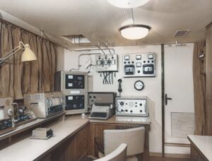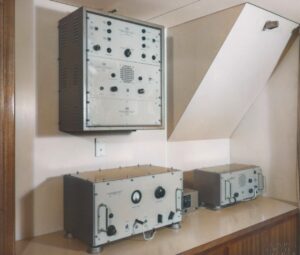 Sul piano del tavolo, in fondo, il ricevitore di soccorso per la 500 kc/s della IRME modello ARGO preceduto dal TX radiotelegrafico di emergenza modello T50-7 (banda della 500 k/s), tra i due apparati il commutatore per l’alimentazione di emergenza a batteria, a paratia il ricevitore del segnale di autoallarme per la frequenza dei 500 kc/s. Ci si può porre la domanda sul perchè la nave fosse stata dotata di due ricevitori di emergenza, semplicemente l’apparato sul tavolo accanto al TX forma una linea completa per essere indipendente in caso di alimentazione di emegenza lasciando libero l’altro ricevitore automatico di funzionare autonomamente per gli usi cui era stato concepito.