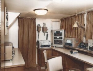 La stazione radio di questa classe di navi del Lloyd Triestino era molto ampia e le installazioni erano le medesime sulle navi gemelle, appaiono sulla mensola del tavolo operatore due ricevitori dell’ALLOCCHIO BACCHINI modello AC16, il primo nell’ordine (parzialmente visibile) è il modello a copertura generale da 1,6 a 25 MHz mentre il secondo aveva la copertura delle Onde Lunghe fino a 1,6 MHz quindi era il ricevitore per l’ascolto della 500 kc/s e per la radiofonia in AM, nell’angolo il trasmettitore radiotelegrafico principale per la banda dei 500 kHz, si tratta del modello T-300-OM della MARCONI ITALIANA, di seguito a paratia il grosso commutatore per le antenne di trasmissione affiancato dal quadro elettrico principale della stazione radio, sotto a parete l’orologio di stazione. Sul tavolo il ricetrasmettiore radiotelefonico in Modulazione di Ampiezza della IRME modello MIZAR con coperura di frequenza fino alla banda degli 8 MHz, una macchina da scrivere dietro la quale appare un dispositivo che al momento non è possibile identificare nell’archivio a disposizione, probabilmente data la posizione poteva trattarsi di un alimentatore.