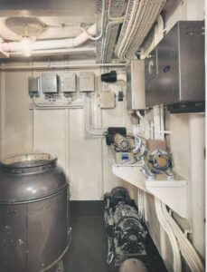 Nella foto 6 siamo nel locale dove erano installati gli inverters e in questo caso anche la girobussola madre, questa veniva chiamata così perchè era la vera girobussola che al suo interno conteneva il giroscopio in quello che veniva chiamato “ELEMENTO SENSIBILE”, la girobussola madre era poi collegata a diverse ripetitrici disposte in vari punti della nave.