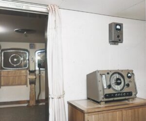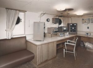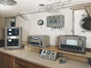Nella foto sopra siamo in sala nautica dove, installato su un mobiletto, appare il radiogoniometro della MARCONI ITALIANA modello 3-3-S-3, il ricevitore di questo RDG aveva la copertura da 225 kc/s fino a 600 kc/s quindi oltre all’impiego normale nell’utilizzo per il rilevamento dei radiofari per la navigazione poteva essere utilizzato per monitorare il traffico di soccorso sulla 500 kc/s ed eventualmente per rilevare la stazione in pericolo.