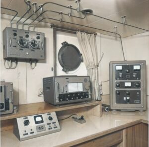 Una panoramica della stazione radio che verrà descritta nelle foto che seguono, nell’archivio di questa nave mancano le fotografie degli apparati di emergenza e dell’ eventuale apparato per le comunicazioni radiotelefoniche sicuramente presenti a bordo ma non nelle immagini dell’archivio. In questa foto si può notare l’apparato per le lance di salvataggio “NAUTILUS” in basso sulla destra della foto (Appoggiato per terra).