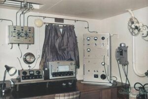 Nella foto 5 sul piano del tavolo verso sinistra si vede il ricetrasmettitore radiotelefonico in Modulazione di Ampiezza di marca IRME, si tratta del modello “ALDEBARAN I°” dotato delle seguenti tre bande operative, da 500 a 1600 kc/s per l’ascolto della Radiofonia Broadcasting, da 1,6 a 2,9 Mc/s per il traffico RTF in Onde Medie e da 8 a 9 Mc/s per le comunicazioni RTF a più grande distanza, mentre in ricezione la sintonia era libera in trasmissione l’apparato era dotato di 5 frequenze quarzate, sopra appaiono i due interruttori a leva per commutatore l’alimentazione di emergenza o per la ricarica delle batterie, sempre a paratia verso sinistra gli ultimi due dispositivi costituiscono il ricevitore del segnale di autoallarme per la 500 kc/s di marca INCAR modello IR 150.