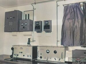 A partire dalla destra della foto dopo gli apparati descritti nella foto precedente, in posizione angolata e installato sul piano del tavolo accanto alla lampada il Trasmettitore radiotelegrafico principale per Onde Corte T 300 OC della MARCONI ITALIANA, di seguito verso sinistra l’alimentatore tipo SERTI per la ricarica della batteria di accumulatori, alla sua sinistra il Trasmettitore radiotelegrafico di emergenza della IRME modello T50-5, sopra un interruttore a leva per comandare la ricarica delle batterie o per utilizzare la tensione di emergenza sull’apparato a cui era collegato.