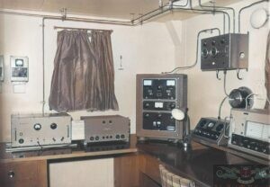 Come la maggior parte delle navi che battevano una bandiera di convenienza anche la M/n “LUCIE” era dotata di un solo ricevitore a copertura generale, in questo caso si tratta di un ALLOCCHIO BACCHINI AC/16 Universale, l’RX con otto bande di frequenza copriva da 75 kc/s a 31 Mc/s nelle modalità A1, A2 e A3. Sulla destra il Trasmettitore radiotelegrafico principale per Onde Medie (banda dei 500 kc/s), si tratta di un apparato prodotto dalla IRME come modello T 120, a fianco un telefono INTERCOM. Sulla sinistra del ricevitore appare il telecomando o centralina per l’avvimento dei gruppi inverter, per la selezione delle tensioni e per altre commutazioni, sopra a paratia l’orologio di stazione e il grosso commutatore per le antenne di trasmissione.
