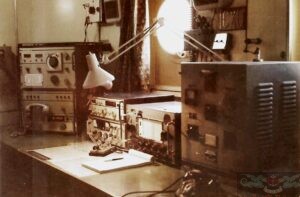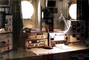 Sulla destra della foto il grosso apparato a forma di cubo è il trasmettitore radiotelegrafico per la banda della 500 kc/s, questo apparato è il modello TS 57 della MAGNETI MARELLI di sicuro presente a bordo con il ricevitore dell’ ALLOCCHIO BACCHINI alla consegna della petroliera. Questo apparato che aveva rivestito il compito di TX di emergenza, probabilmente nel tempo era diventato il trasmettitore principale per le Onde Medie con possibilità di alimentazione a batteria in caso di emergenza, l’apparato poteva erogare circa un centinaio di Watt, queste considerazioni scaturiscono dal fatto che l’altro trasmettitore presente a bordo, visibile in fondo a sinistra, era un TX “All Mode” ma senza la copertura in trasmissione della banda dei 500 kc/s, l’apparato era il modello DANCOM HF 400 dotato del suo eccitatore modello E 201, con copertura in trasmissione da 1,6 Mc/s fino a 3,8 Mc/s e delle bande HF dei 4, 6, 8, 12, 16, ,22, 25 Mc/s, la massima potenza erogata dal TX era di 400 Watt riducibili fino a 100 W. L’apparato in trasmissione era pilotato dal suo eccitatore dove erano programmate le frequenze di trasmissione sia nella banda delle Onde Medie che in HF dove poteva disporre di 15 frequenze canalizzate su ogni banda, sempre sull’eccitatore si commutava la modalità di trasmissione, il trasmettitore era provvisto di modulatore del segnale di allarme per la 2182. Nella stazione sono presenti vari accessori, dal tasto telegrafico di tipo semiautomatico alla cuffia, a paratia sono installati un commutatore per le antenne di ricezione, degli altoparlanti esterni, la targa con il nominativo della nave, sul tavolo ancora un telefono INTERCOM e altri dispositivi necessari al funzionamento della stazione.