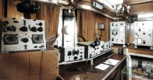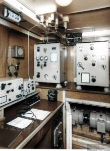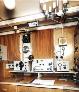 Nella foto 3 da sinistra il ricevitore delle Officine Marconi modello R 251 per la banda delle Onde Lunghe seguito dal ricevitore a reazione sempre della Marconi Italiana modello R 394 con copertura delle Lunghezze d’onda da 2500 metri fino a 100 metri adatto a ricevere sia la radiotelegrafia che la radiotelefonia, questo ricevitore era realizzato appositamente per i pescherecci oceanici, di seguito il Trasmettitore radiotelegrafico di emergenza modello T 335; sotto la mensola sulla destra vari tasti telegrafici ognuno collegato al suo trasmettitore, delle cuffie per l’ uscita ad alta impedenza dei ricevitori, un orologio di stazione sormontato da un quadro elettrico per la ricarica delle batterie per l’alimentazione di emergenza, sulla destra a parete un altoparlante esterno mentre sul cielo della stazione radio si può vedere il commutatore a coltello per le antenne di trasmissione.