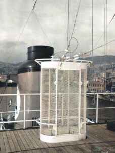 Nella foto 3 sul tavolo appare il trasmettitore di emergenza per la banda della 500 kc/s della IRME modello T 50-5, sulla sua sinistra il commutatore per le tensioni di alimentazione, per terra del suo alloggiamento a cavalletto il ricetrasmettitore per lance di salvataggio si tratta del modello NAUTILUS; installato a paratia il primo apparato è il ricevitore del segnale d’allarme per la 500 kc/s della IRME, sulla destra della foto in zona avanti il grosso ricetrasmettitore radiotelefonico in Modulazione di Ampiezza per Onde Medie e Corte della IRME modello ORIONE.