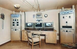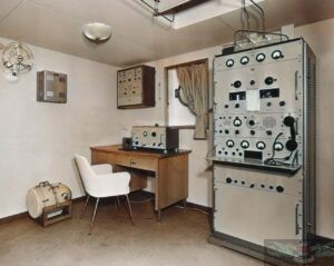 In questa foto una panoramica della stazione radio per allora equipaggiata con i più avanzati apparati prodotti in Italia. Si tratta di una stazione installata e successivamente gestita dalla S.I.R.M. (Società Italiana Radio Marittima). La nave montava due ricevitori prodotti dalla MARCONI ITALIANA, il ricevitore montato a destra nella consolle è il modello RV 102A con copertura in cinque bande da 45 a 1500 kHz, il ricevitore montato a sinistra invece è il modello RV 102 con copertura in sei bande da 1500 kHz a 25 MHz. Al centro della consolle tra i due ricevitori un pannello dove venivano centralizzate alcune commutazioni come quella dell’avviamento degli inverter, le commutazioni del tasto radiotelegrafico sui vari trasmettitori, la possibilità di un altoparlante centralizzato, le commutazioni per l’alimentazione d’emergenza a batterie e altri comandi. A paratia nella zona centrale della consolle e poco sopra il rack dei ricevitori un pannello per lo smistamento delle antenne di ricezione, sopra il grosso commutatore per le antenne di trasmissione, a destra di questo dispositivo appare l’orologio di stazione mentre sulla sinistra la targa con il nominativo internazionale della nave. Ai lati del tavolo operatore ci sono i due grossi trasmettitori radiotelegrafici principali prodotti dalla MARCONI ITALIANA, il TX sulla sinistra è il modello TC109A che era il trasmettitore per le Onde Corte, sulla destra appare il TX modello TC-110 OM per le Onde Medie.