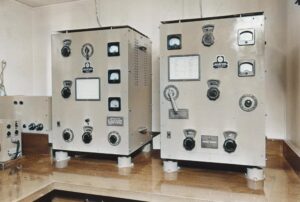 Nella foto 3 i due Trasmettitori radiotelegrafici principali, quello di sinistra è il modello T 262/A.C. e lavorava sulla banda dei 500 kc/s mentre il TX di destra – modello T 262/AC/6 – copriva le Onde Corte, entrambe i trasmettitori erano prodotti dalla MARCONI ITALIANA. Sulla sinistra del primo TX si intravvede un alimentatore.