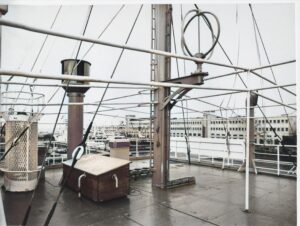 Una vista della controplancia con il cassone di legno per le batterie di emergenza, l’antenna del radiogoniometro e le uscite della antenne della stazione radio.