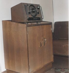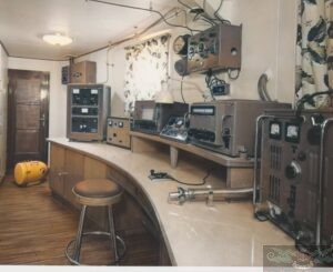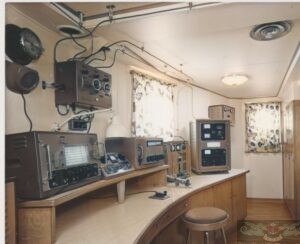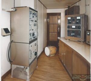 In questa foto c’è la quasi totalità degli apparati della stazione radio, il primo sulla destra è il trasmettitore di emergenza modello T40-SM di produzione IRME, sul tavolo appoggiato nello scalmo il tubo portavoce, Sulla mensola il primo apparato è un ricevitore della MARCONI ITALIANA modello R 1241 con copertura dalle Onde Lunghe fino ai 3 MHz e quindi destinato all’ascolto della 500 kc/s segue la consolle/telecomando per l’avviamento degli inverter e per altre commutazioni. Il ricevitore successivo è l’ALLOCCHIO BACCHINI AC/16 con copertura generale da 1,4 a 25 MHz. Appoggiato sul piano del tavolo il grosso alimentatore a cui segue il Trasmettitore radiotelegrafico principale per le Onde Corte T-300-OC di produzione MARCONI ITALIANA, per terra, alloggiato nel suo cavalletto, l’apparato di soccorso per le lance di salvataggio modello NAUTILUS. A paratia, in corrispondenza dei due ricevitori il commutatore per le antenne di trasmissione e sotto quello per le antenne di ricezione, sulla destra l’orologio di stazione e un altoparlante esterno.