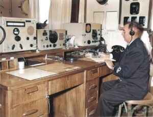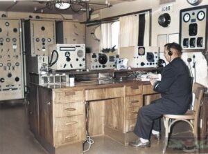 L’Ufficiale RT che appare nelle foto è sconosciuto né esiste nell’archivio annotazioni che lo identifichino, sarebbe gradito poter aggiornare questo articolo con il suo nome qualora qualcune ne avesse conoscenza. Nella foto appare il tavolo dell’operatore con i ricevitori, il primo sulla destra è il modello R781 prodotto dalle Officine Marconi di Genova che copriva da 62 kHz fino a 23 MHz in modalità A1 e A3, il ricevitore che si trova al centro della mensola è sempre di produzione delle Officine Marconi di Genova, si tratta del modello R521 con copertura delle Onde Lunghe e inizio delle Onde Medie, il ricevitore sulla sinistra quindi sul davanti della foto è il CR-300 (YEOMAN) della MARCONI Inglese che in otto bande copriva da 15 kHz a 25 MHz sia in A1 che in A3, molto probabilmente era il ricevitore usato per le comunicazioni radiotelefoniche grazie anche alla possibilità della scala di sintonia che rendeva più agevole la centratura e quindi l’ascolto delle stazioni in AM, sulla parete verso l’Ufficiale marconista appaiono due quadri che sembrano essere uno, l’elenco delle abbreviazione radiotelegrafiche e l’altro forse le consegne da espletare durante le guardie. Ciò che non è ben in evidenza in questa foto sarà descritto nella successiva.