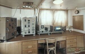 Nella foto sono inquadrati gli apparati principali che costituiscono la stazione radio della M/c “Andromeda”, nell’archivio di questa nave manca una foto che inquadri gli apparati di emergenza e soccorso, molto probabilmente questa foto fu scattata per fini promozionali della Compagnia di Navigazione e non per l’archivio della Compagnia radio. Sulla mensola del tavolo dell’operatore appaiono i due ricevitori in dotazione, quello di destra è l’ R 1241 della MARCONI ITALIANA con copertura dalle Onde Lunghe fino ai 3 MHz in A1, A2 e A3, era il ricevitore destinato all’ascolto della 500 kc/s infatti sulla sua destra un pò verso il retro si può notare il commutatore per l’alimentazione di emergenza obbligatoria per i ricevitori che coprivano la banda della 500, l’altro ricevitore era prodotto dalle Officine Marconi di Genova e si tratta del modello R 781 con copertura da 62 kHz a 23 MHz nelle modalità A1, A2 e A3; sulla sinistra di questo ricevitore appare il Trasmettitore radiotelegrafico principale della MARCONI ITALIANA prodotto come modello T 282/AC apparato funzionante sulla Banda delle Onde Lunghe e Medie (500 kc/s), più a sinistra il Trasmettitore radiotelegrafico principale per la Banda delle Onde Corte con copertura dagli 8 ai 16 MHz, si tratta del modello T 262/1 sempre della MARCONI ITALIANA. Sotto il piano del tavolo c’è la leva di avviamento dei gruppi motori per le tensioni necessarie al corretto funzionamento della stazione radio in particolare per le anodiche dei trasmettitori, sul cielo della stazione si può notare il grosso commutatore a coltello per le antenne di trasmissione mentre sulla destra della foto il grande sportello in legno usato per le comunicazioni tra Ponte di Comando e la Stazione RT, sopra si può notare l’orologio di stazione con i minuti di silenzio per la grafia.