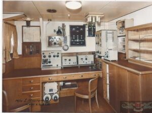 Nella foto 2 sul tavolo dell’operatore sopra la mensola i due ricevitori di cui la nave era dotata, quello di destra è il tipo R-286 della Officine Marconi di Genova era un apparato a valvole e del tipo supereterodina per Onde Medie e Onde Lunghe con copertura dai 300 ai 4.000 metri di lunghezza d’onda, sulla sinistra il ricevitore modello R-285 per Onde Corte, copriva dai 12 ai 100 metri, montava 6 valvole ed era sempre un RX supereterodina. Il grosso apparato a sinistra dei ricevitori è il radiogoniometro tipo DF-M3 RX-M3, la parte superiore era costituita dal ricevitore mentre la parte inferiore era il radiogoniometro vero e proprio, si trattava già di un apparato evoluto nel quale per effettuare la misura dei rilevamenti dei radiofari non era più necessario ruotare l’antenna perchè il c.e.m. ricevuto era riprodotto all’interno dello stesso apparato e quindi attraverso la rotazione di una bobina mobile si poteva effettuare la misura del rilevamento desiderato. Sulla destra del tavolo operatore ci sono due trasmettitori, l’apparato grande era il Trasmettitore radiotelegrafico principale della MARCONI ITALIANA modello T 282 per Onde Medie e Lunghe a fianco il TX d’emergenza delle Officine Marconi del tipo a scintilla frazionata. Sotto il tavolo sulla sinistra la sezione di avviamento per i gruppi motori per l’alimentazione degli apparati, a paratia si notano diversi quadri elettrici e sul cielo della SRT il commutatore a coltello per le antenne di trasmissione.
