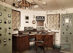 La stazione radio della M/c TAORMINA era costituita da apparati esclusivamente prodotti dalla MAGNETI MARELLI, sulla mensola del tavolo operatore sono installati due ricevitori della citata Ditta, il ricevitore sulla sinistra è il modello RP-19 con copertura da 65 kHz a 1600 kHz in 4 bande e nelle modalità A1 e A3, era il ricevitore per l’ascolto e il traffico sulla banda dei 500 kHz. Il ricevitore sulla destra è il modello RR1A-S con copertura da 1,5 a 30 MHz su 5 Bande in A1 e in A 3, entrambi i ricevitori erano dotati di sintonia normale e sintonia fine tramite un verniero. Sotto il tavolo installati su una mensola si vedono i rispettivi alimentatori dei due RX. Tra i due ricevitori appare un altoparlante esterno come in alto a paratia ne appare un altro probabilmente collegato al primo ricevitore che copriva la 500, sempre a paratia appaiono una lampada, l’orologio di stazione con i minuti di silenzio per la grafia e un quadro elettrico con dei fusibili ceramici, credo si trattasse del quadro elettrico principale della stazione, sulla destra il tubo porta-ordini tra stazione radio e Ponte di Comando. Il grosso trasmettitore che appare sulla sinistra della foto è il Trasmettitore radiotelegrafico principale per la banda della 500 kc/s, si tratta del modello TS-40 mentre il grosso trasmettitore sulla destra era il TX principale per Onde Corte, dalla documentazione a disposizione risulta essere il modello TS-42 con copertura delle bande dei 4, 6, 8, 12, 16 e 22 MHz e dotato di 10 frequenze quarzate su ogni banda, sul cielo della stazione, nei pressi del TX per la 500, si nota il grosso commutatore per le antenne di trasmissione. In foto non sono visibili gli apparati di soccorso e di emergenza probabilmente ubicati in una delle pareti della stazione RT non fotografate.