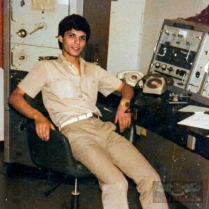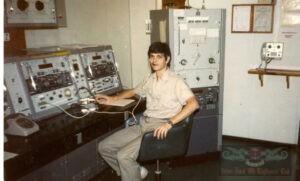 Nella foto l’Ufficiale RT Giuseppe Serpe è impegnato nel servizio di ascolto sulla frequenza di 500 kc/s. La nave era equipaggiata con una stazione radio MARCONI MARINE, configurata secondo lo standard tipico dell’epoca: una console comprendente i ricevitori e i dispositivi di emergenza, affiancata da due trasmettitori ad alta potenza modello “CONQUEROR SD”, capaci di garantire collegamenti affidabili su lunghe distanze.